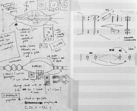 My first thought was that if there was no beginning or end to this music, using a drone would probably make sense – set one constant, unchanging element and pivot everything else around it. I slapped together a Spotify playlist of references I could think of, then got sketching.